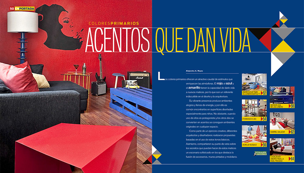 En esta publicación arquitectos y diseñadores fueron invitados a realizar propuestas de distintos espacios utilizando los colores primarios como elementos distintivos que acentuaran el ambiente. En nuestro caso el área donde desarrollamos esta propuesta fue en la sala de TV de un departamento donde se logró plasmar la escencia jovial, relajada y con toque artístico en el espacio.