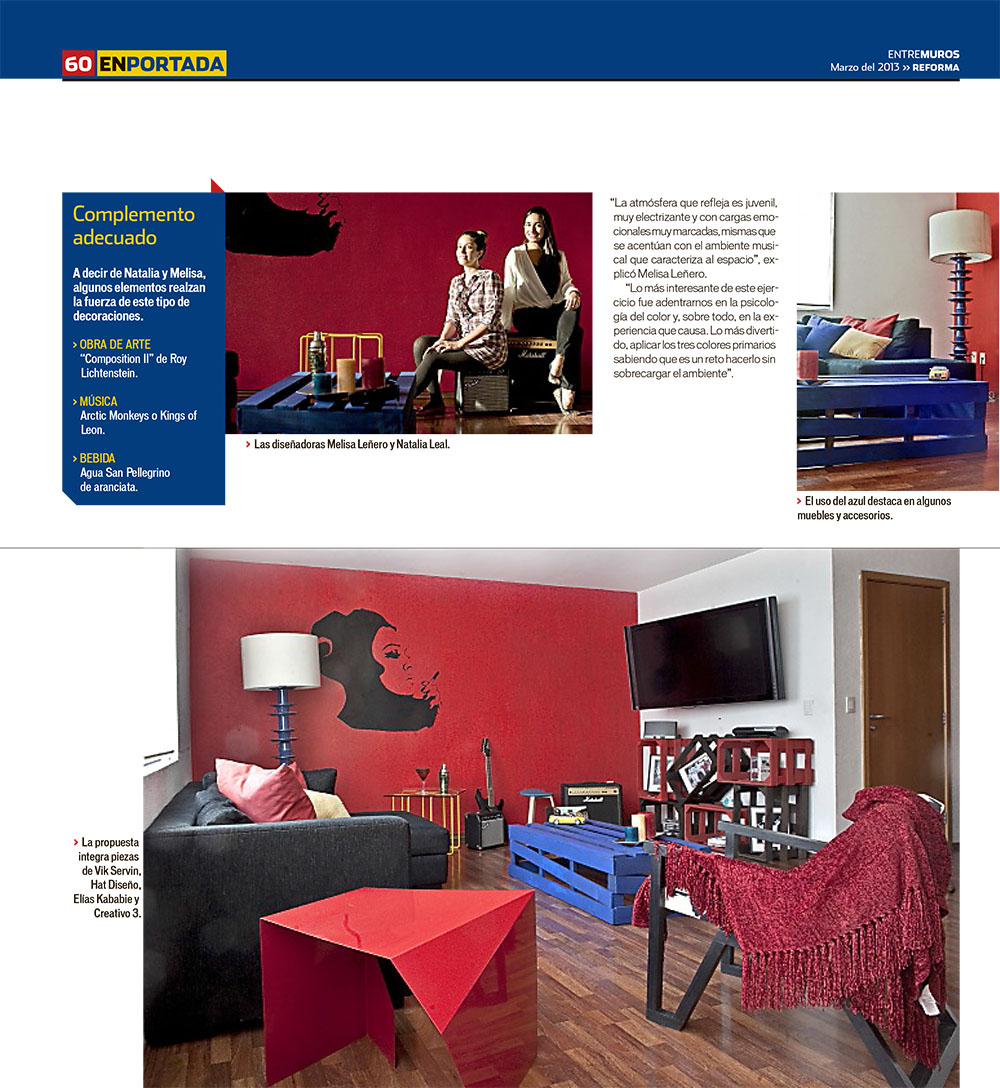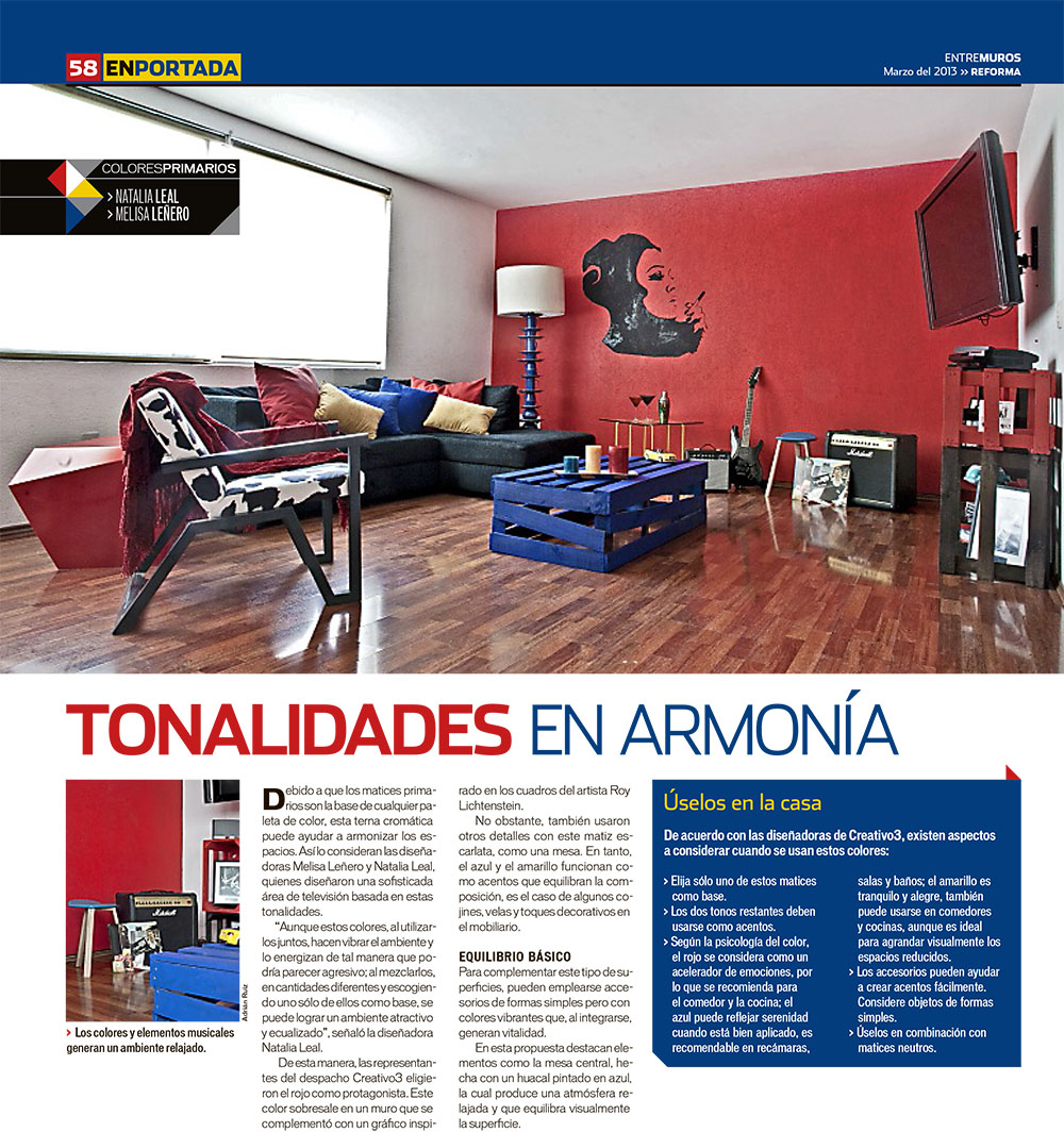 Bien dicen que el tiempo pasa volando y este año nos lo está demostrando pues ya estamos en Marzo y  éste mes no quiere quedarse atrás ya que participamos en un número de Entre Muros, suplemento del periódico Reforma, con el artículo “Colores Primarios – Vibrantes Matices”.