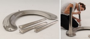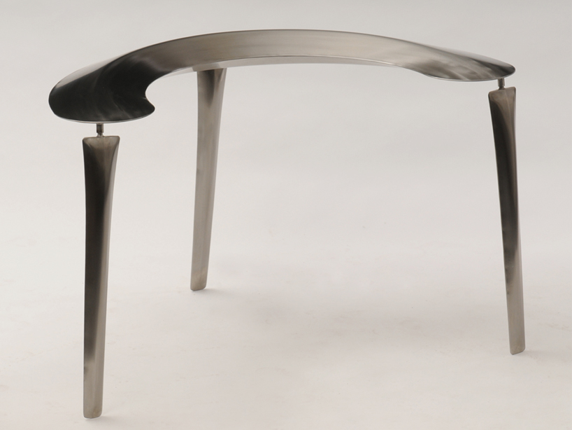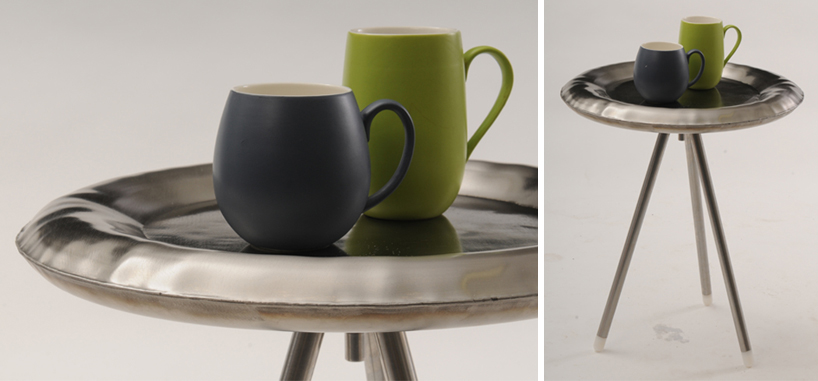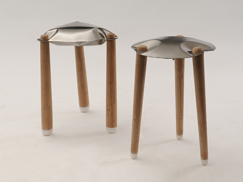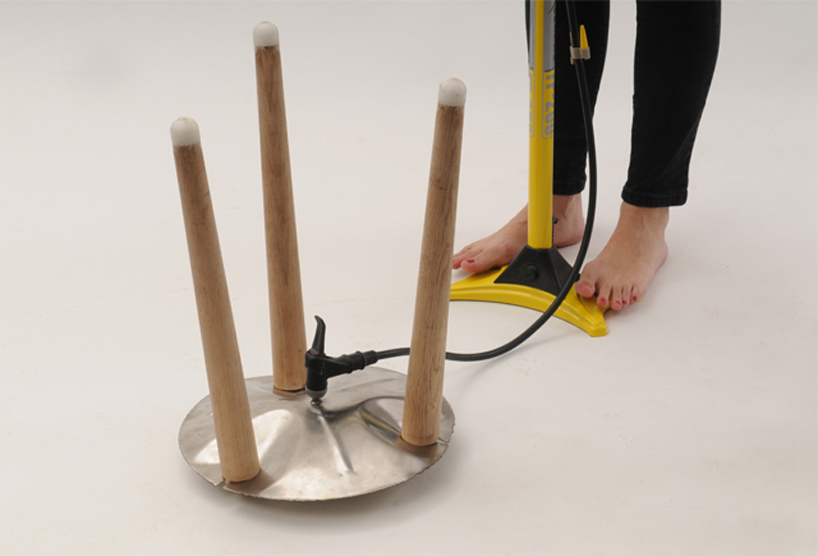“Puff”, es un banquito, cuyo asiento se infla por medio de una simple bomba para bicicleta. En unos instantes la placa de metal, que pareciera estar en 2D, se transforma en un elemento 3D. Las patas de este banco son de madera permitiendo tener el soporte necesario para poder sentarse, aguantando hasta que se paren sobre él. Al ser inflado el metal, el espacio en el que se colocan las patas se reduce y logra que se mantengan en su lugar.